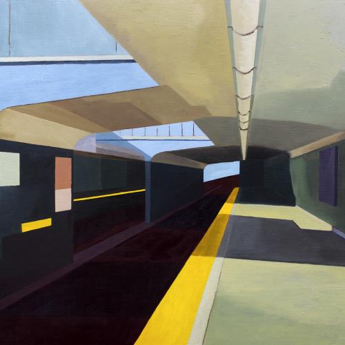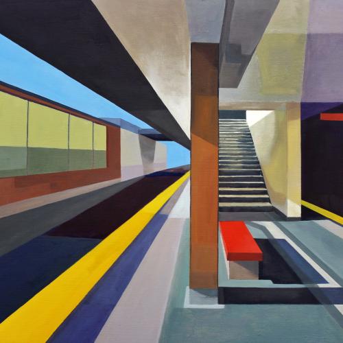 Diogoโs works revolve around the idea that forms of "beauty" often go unnoticed, yet contain qualities which provide a positive basis for a better life. Beauty is conceptualised as balance and structure, shown through the simplification of geometric shapes and colour. Diogo uses urban locations as the focus for his works, such as alleyways and train stations, with the purpose of portraying areas that are often over looked or ignored due to the fast pace nature of urban environments. Placing these in a confined area such as a wood panel makes it a focus for the viewer to emerge themselves into.